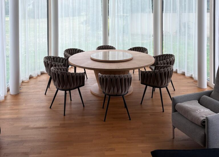 Ein besonderes Highlight unserer Arbeit: Ein runder Esszimmertisch mit einem 360° drehbaren Sockel und einer Tischplatte mit zusätzlicher Glasscheibe. Die Tischsäule im Pyramidenstumpf-Design wurde in aufwendiger Handarbeit gefertigt.